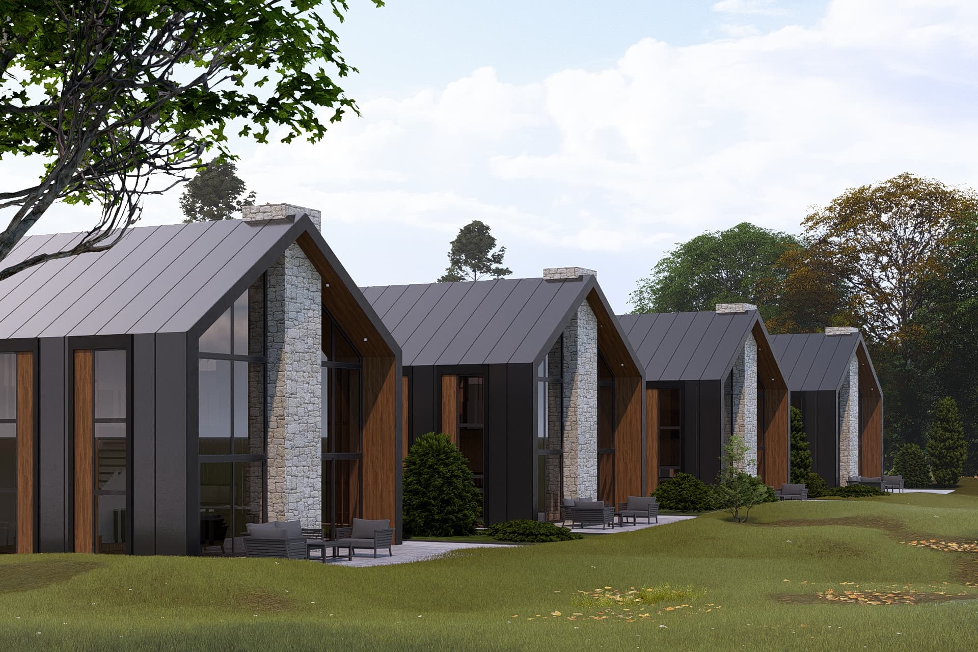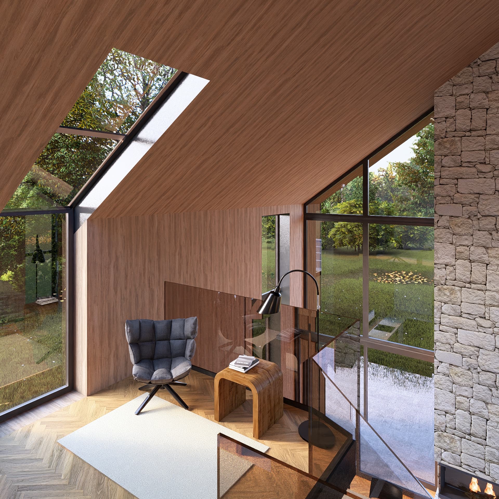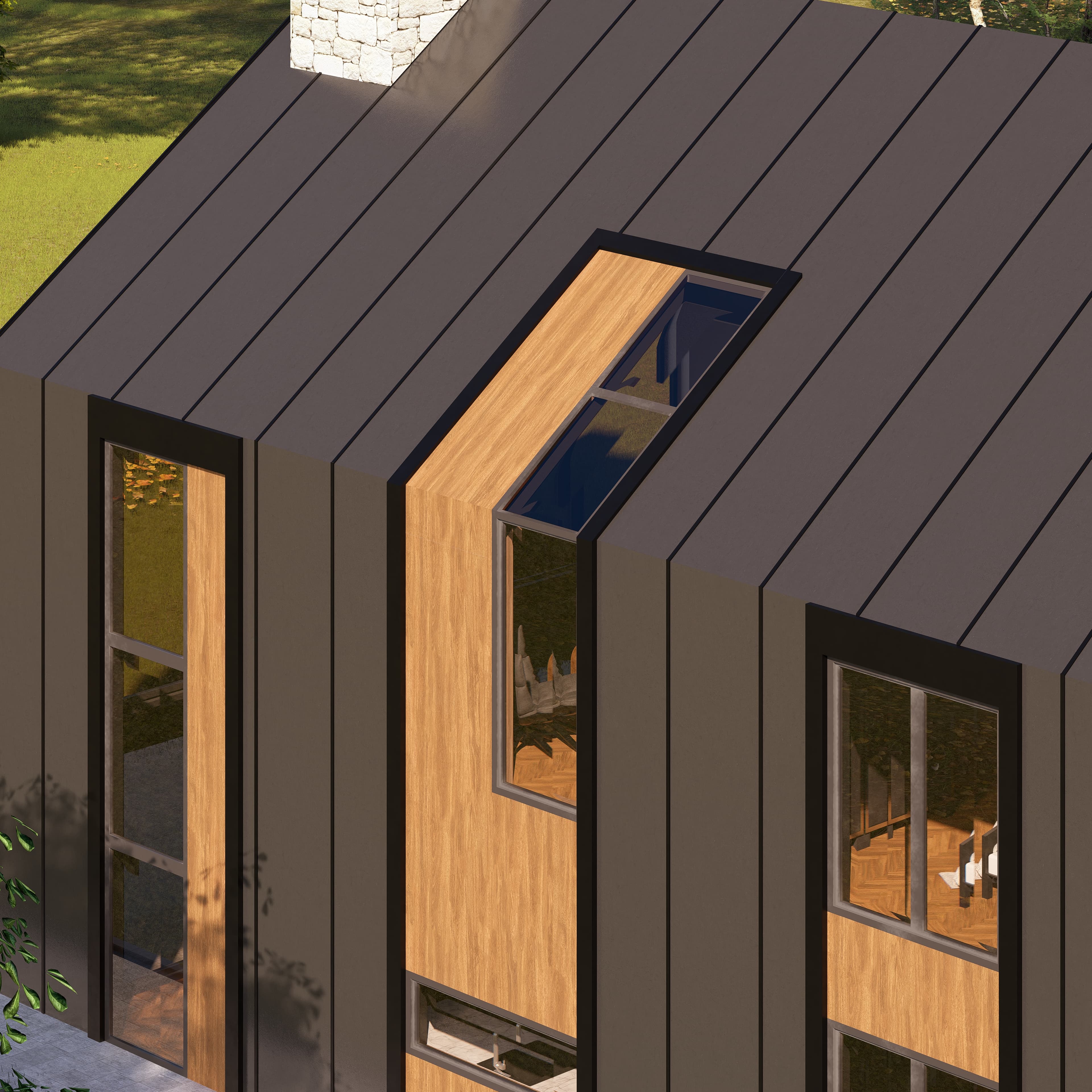 Die Fassaden zeichnen sich durch großzügige Verglasungen aus, die die Innenräume mit Tageslicht durchfluten und gleichzeitig die Wohnräume nahtlos mit dem Außenbereich verbinden. Vertikale und horizontale Linien betonen die Präzision, während die Integration warmer Holzakzente die architektonische Komposition mildert.